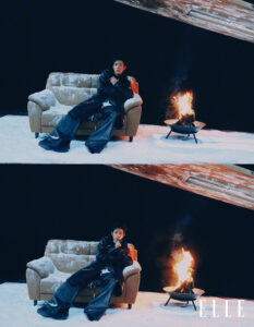 Inside the photography studio, the white mist lingered, enveloping the “snow”. A leather sofa lay nestled within the “snow”, and a winter was being constructed. Before this, it was summer; long water pipes meandered up the walls, climbing to the skylight of the set, where rain fell. Before that, ginkgo leaves fluttered down, it was autumn. Before that, apricot blossoms filled the air, it was spring.